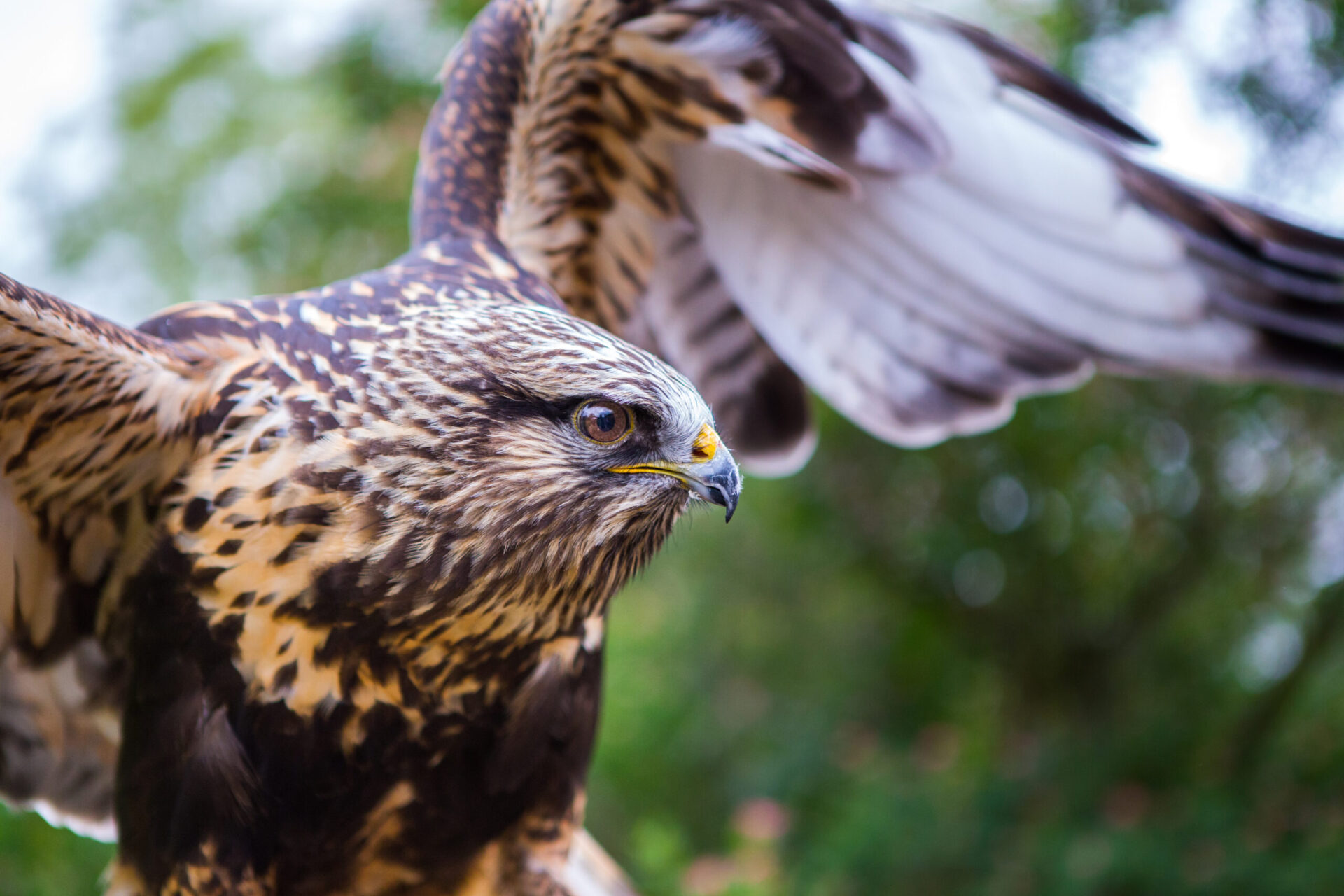 Elle est originaire de la Saskatchewan où elle aurait fait un accident : un face à face avec une voiture. Cet accident ne l’a pas tué, mais lui a désarticulé ses deux ailes, ce qui ne lui permet plus de faire de longs vols ou de planer sur une grande distance, car elle se fatiguerait rapidement. Elle a donc été recueillie par le Zoo de Granby pendant plusieurs années. Par la suite, puisqu’elle était vieillissante, le Zoo a voulu lui offrir une retraite tranquille au Musée. Il faut savoir que son passé d’oiseau sauvage la rend très impulsive, mais sans méchanceté.